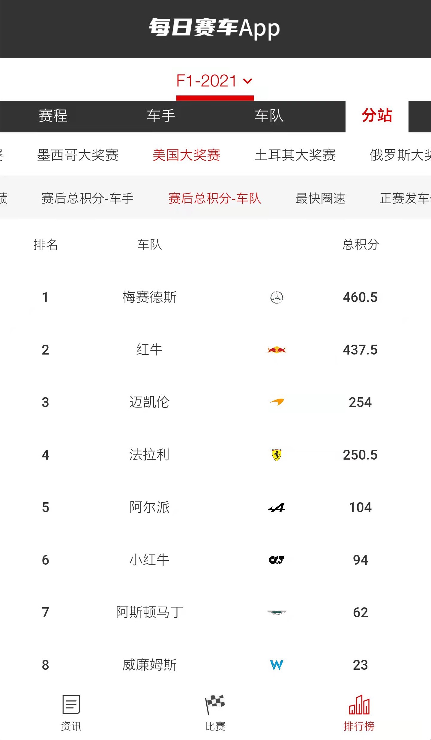 (美国站后车队积分榜,迈凯伦第三)