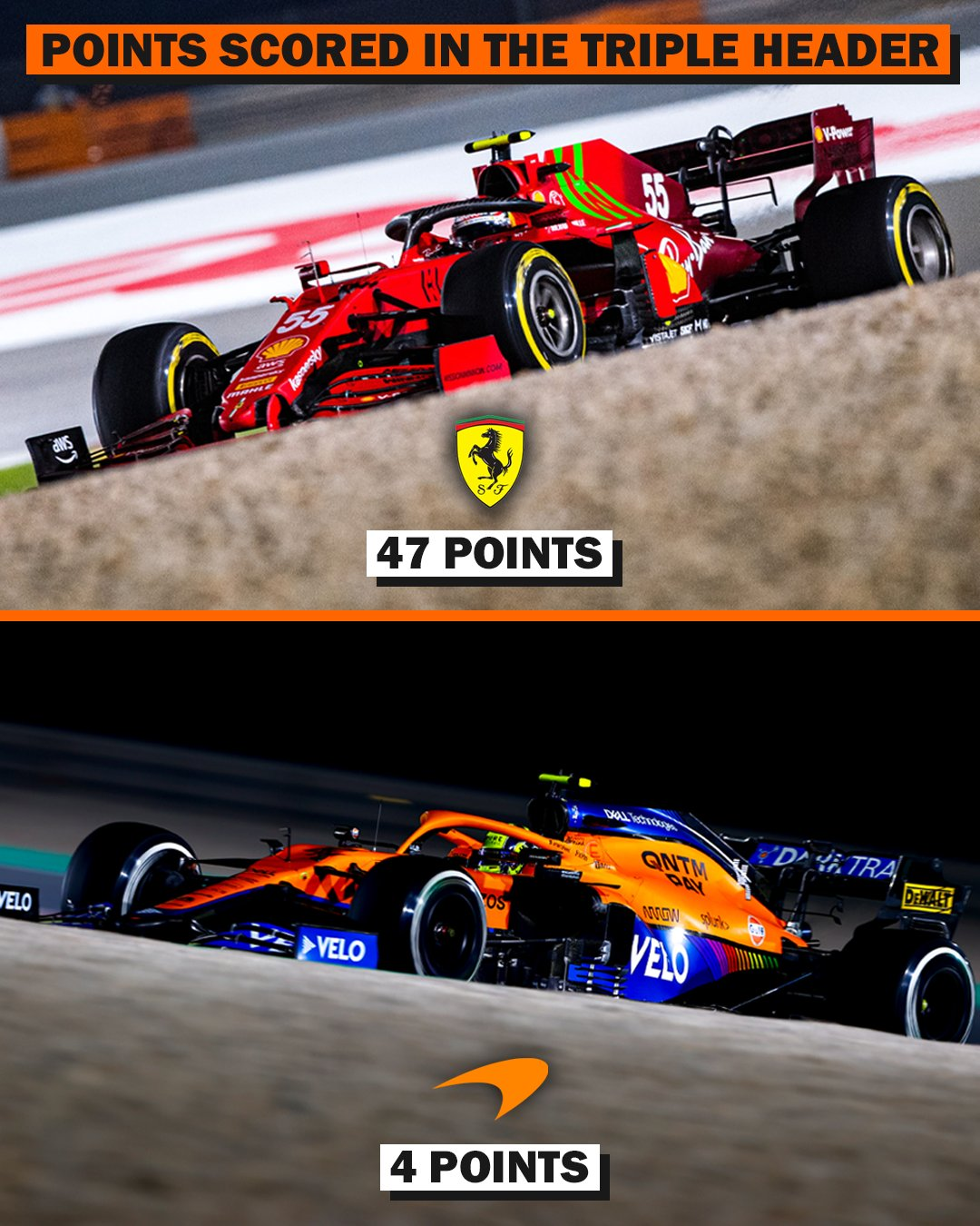 然而,三连背靠背比赛,法拉利依旧勇猛拿下47分,而迈凯伦仅收获4分,法拉利成功反超。