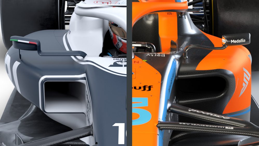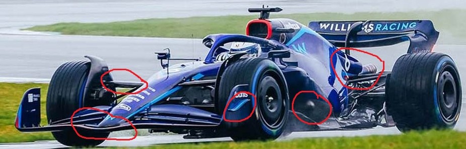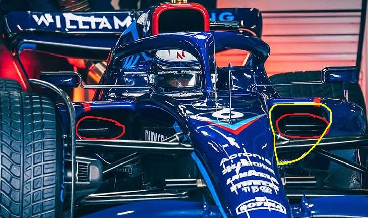 如果是有侧开口的话,那也是对全高侧箱设计车有好处,有比较平直的流向尾部气流,而威廉姆斯侧箱下洗的气流其实流向尾部的气流能量是限制的。