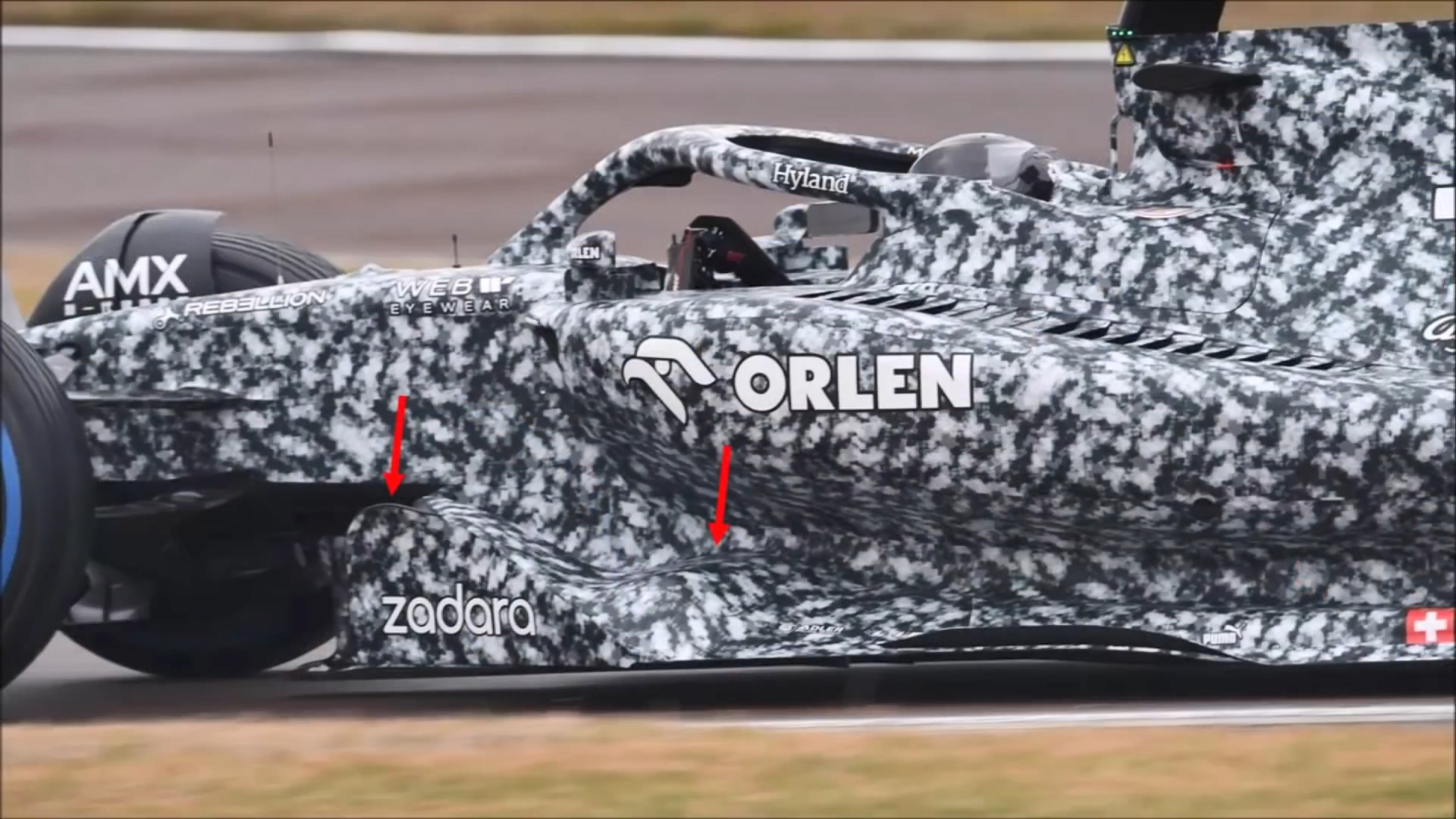 说回车本身,AT03的前翼真的如规则规定的一样老实,四片前翼都直接连接在鼻锥上,整体是个简单保守的设计,涡流发生器也像哈斯一样低调(小)。