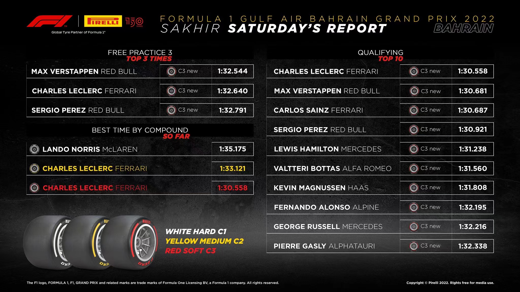 巴林大奖赛排位赛已经结束,进入Q3的10位车手均使用全新的C3软胎做出的最快圈速。相比排位赛第三节,勒克莱尔和维斯塔潘成绩提升明显。