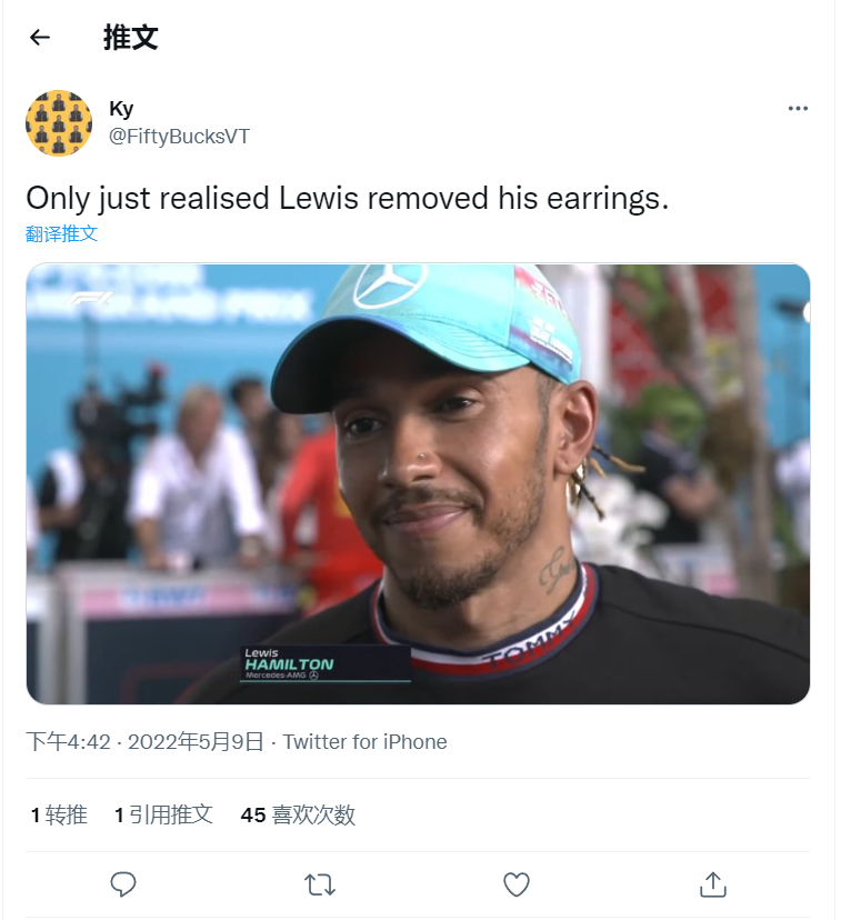 推特有网友发现,在昨天赛后采访时,汉密尔顿没有佩戴耳环。不过他的鼻钉依然没有取下。