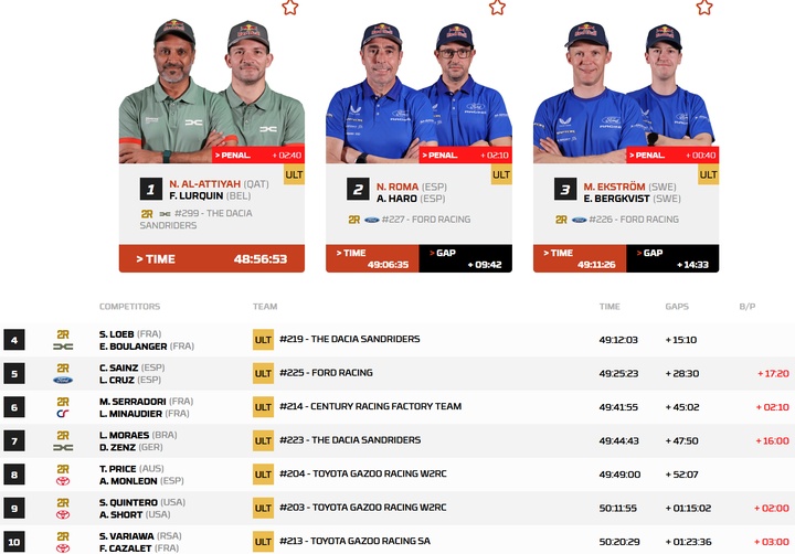 以下为2026年达喀尔拉力赛汽车组总成绩榜前十: