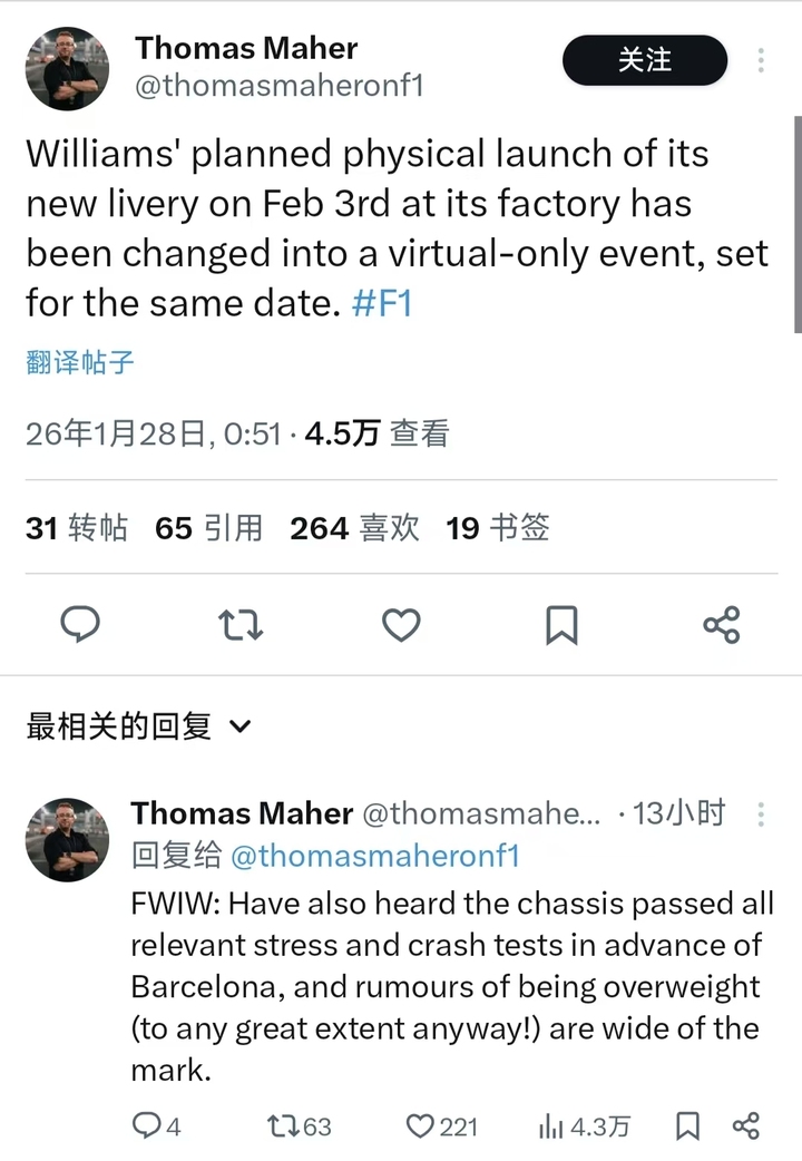 马赫首先表示,威廉姆斯车队在当地时间2月3日进行的涂装发布会已经改为以线上直播形式的进行。