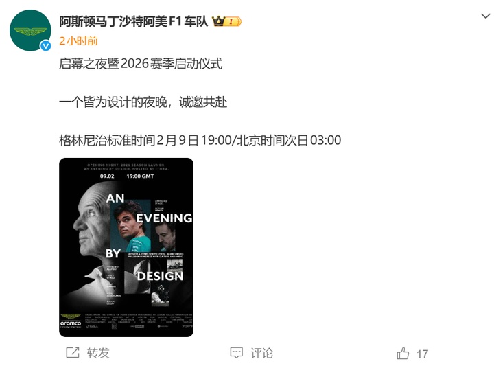 阿斯顿马丁:赛季启动仪式将在2月10日凌晨3点进行