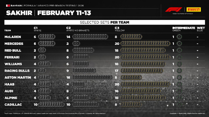 倍耐力公布十一支车队在巴林冬测首轮测试的轮胎配方。测试轮胎方面,11支车队在本周只能使用C1、C2、C3三种配方;到下周,C4、C5才会开放作为选项。