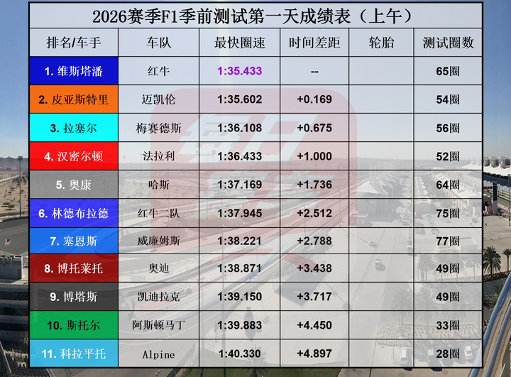 巴林第一天测试上午结束,塞恩斯一共完成77圈占据里程榜榜首,最快圈则由维斯塔潘做出,圈速为1分35秒433。