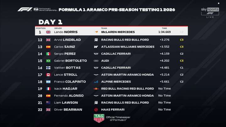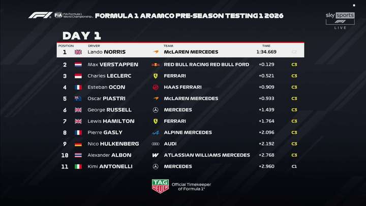 巴林首日测试全部结束,在今天下午的测试当中,诺里斯以1分34秒669的成绩位列第一,维斯塔潘、勒克莱尔分别位列第二和第三。