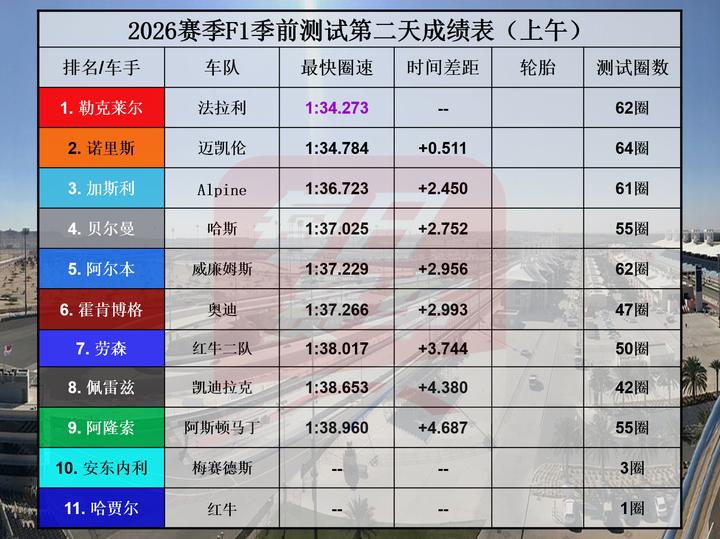 巴林测试第二天上午结束,勒克莱尔1:34.273拿到P1,这个成绩比昨日最佳成绩诺里斯的1:34.669更快,诺里斯、加斯利分列P2、P3