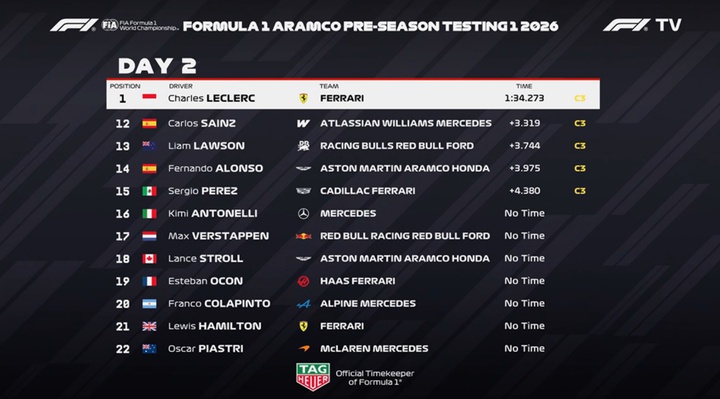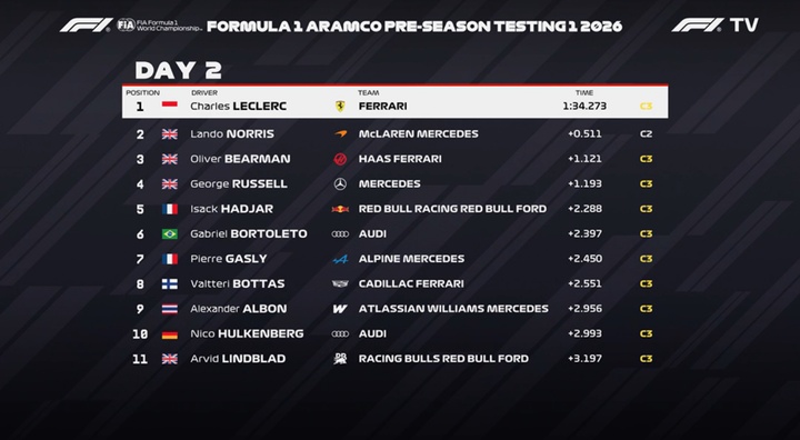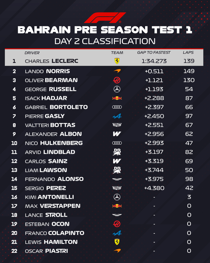 巴林测试第二日结束,勒克莱尔上午做出1:34.273拿到P1,这个成绩比昨日最佳成绩诺里斯的1:34.669更快,诺里斯、贝尔曼紧随其后。