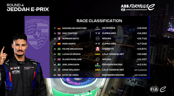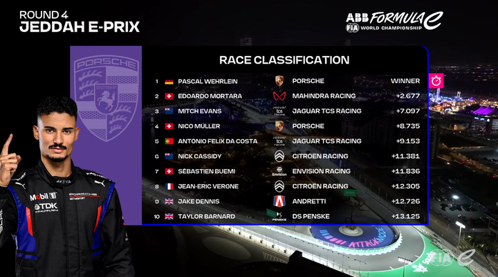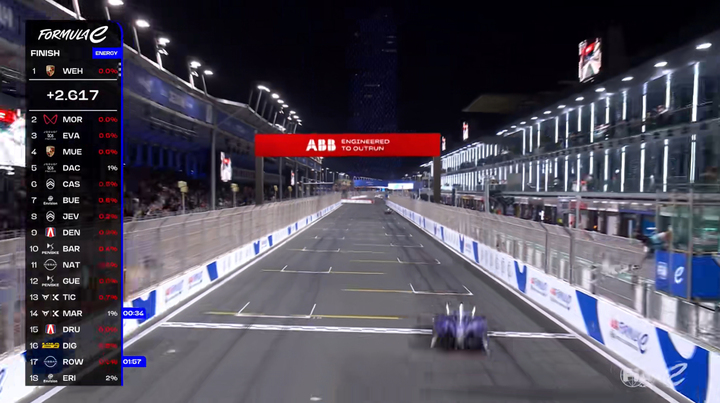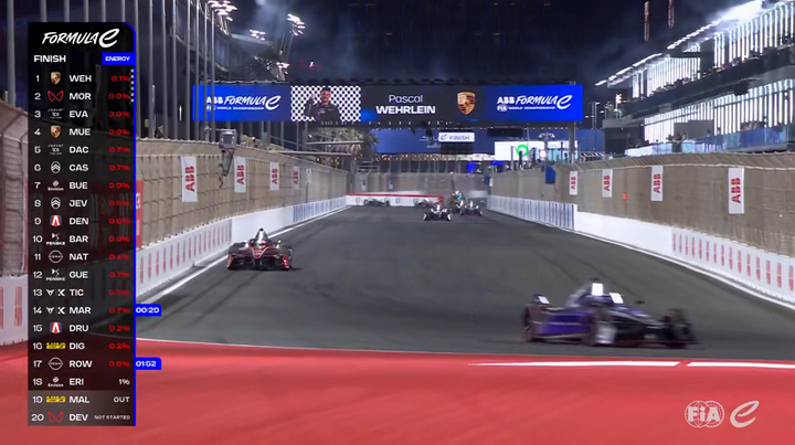 北京时间2月14日凌晨,FE沙特吉达站第一个回合赛事的正赛在吉达赛道进行。来自保时捷厂队的维尔莱茵凭借准确的进站快充时机在回到赛道后卡到头名,随后借助攻击模式的帮助就此一骑绝尘。维尔莱茵在他生涯所参与的第100场FE赛事中拿下了一个里程碑式的分站冠军。