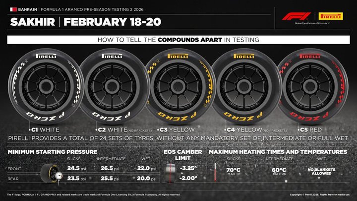倍耐力公布十一支车队在巴林第二轮冬测的轮胎配方。测试轮胎方面,C1、C2、C3、C4、C5都可以选择。