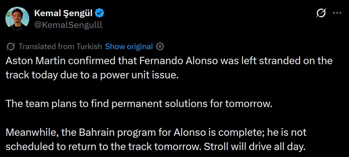 土耳其Motorsport.com记者Kemal Sengul报道,阿斯顿马丁证实,阿隆索在巴林冬测第二轮第二天下午停车的原因是动力单元故障。