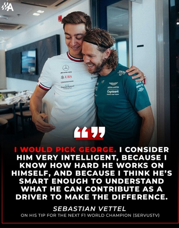 维特尔:“我看好拉塞尔拿下今年的世界冠军,他是个非常有智慧的车手,我也知道他付出了多少努力。而且他足够聪明,可以知晓作为车手,他可以在什么地方做出贡献,并脱颖而出。”