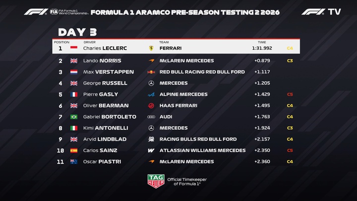 最终勒克莱尔拿到了本次冬测最后一天的P1,诺里斯P2、维斯塔潘P3、拉塞尔P4、加斯利P5,从冬测的成绩来看,四大车队依然占据领先地位,但谁能成为今年的最大热门,还要等到澳大利亚大奖才能见分晓!