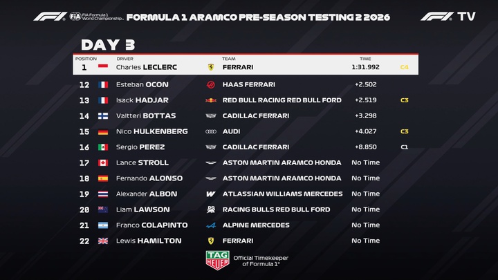 北京时间2026年2月20日,巴林冬测迎来最后一天的测试,在今天上午的测试当中,勒克莱尔跑出了1分33秒689的成绩位列第一;下午的时候勒克莱尔更上一层楼,跑出了1分31秒992的成绩,刷新了今年巴林冬测的最快圈速!