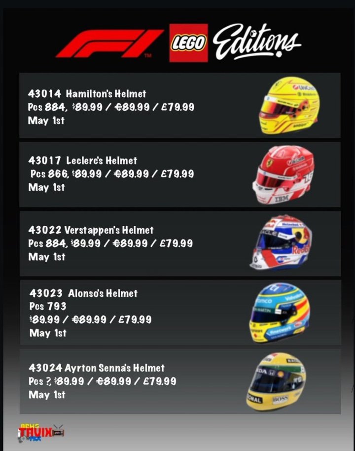 乐高首批头盔模型5月1日发售,定价89.99欧元,五位车手分别为:汉密尔顿、勒克莱尔、阿隆索、维斯塔潘和塞纳