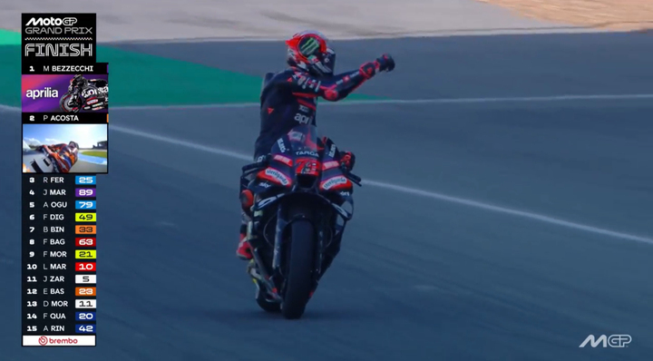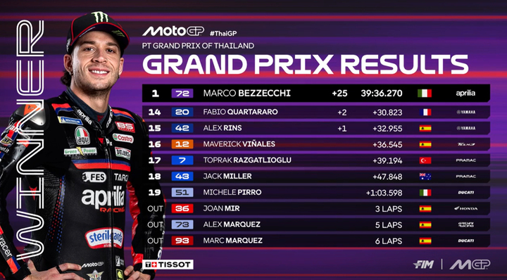 MotoGP泰国站正赛,杆位起步的贝塞奇在发车阶段守住领先位置之后就此一骑绝尘,他最终以超过5.5秒的优势率先冲线并拿到了本赛季的首个分站冠军。