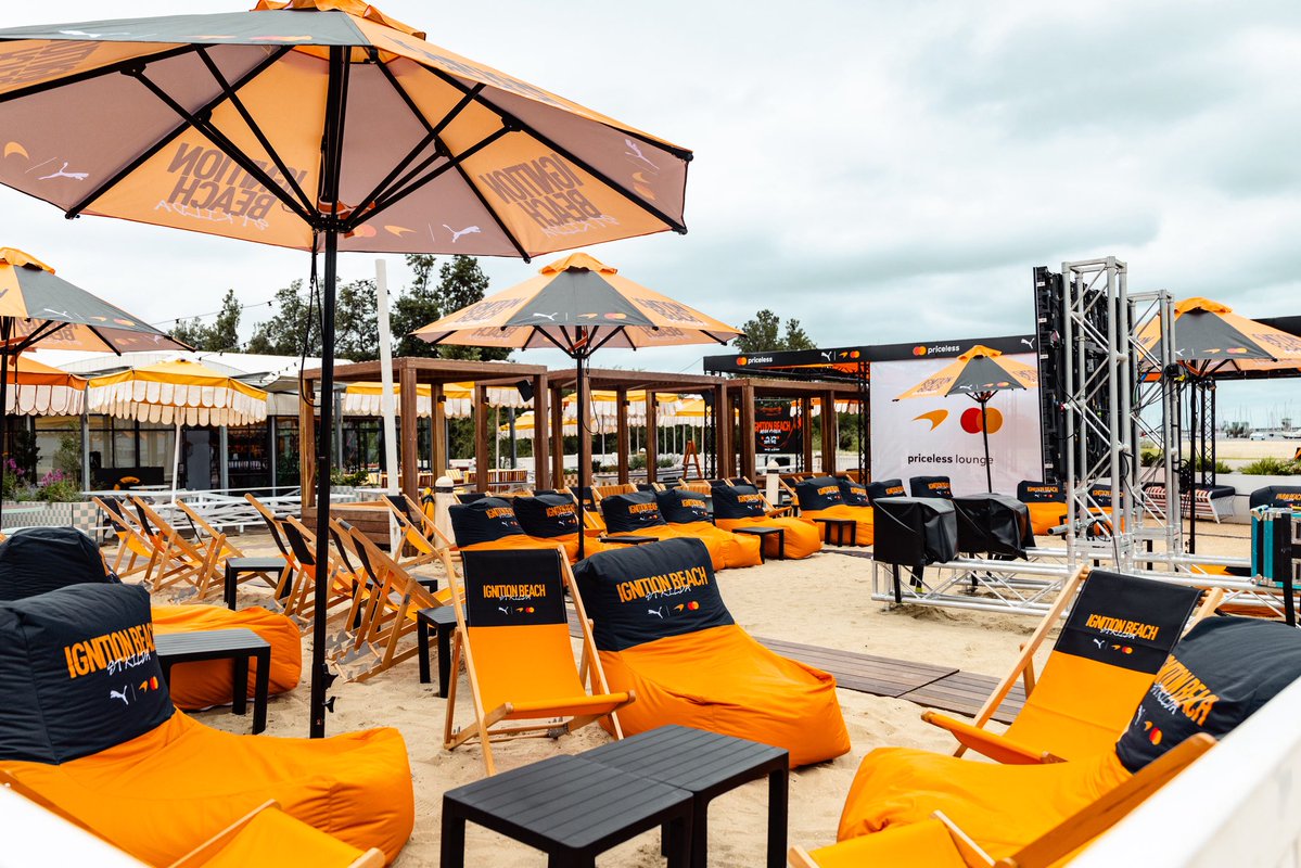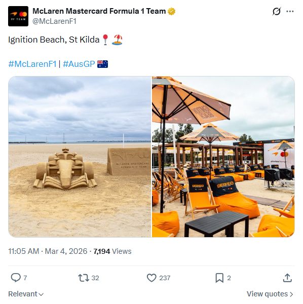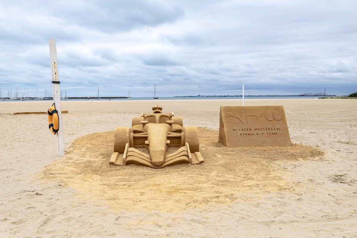 迈凯伦车队圣基尔达海滩用沙子堆起了一台迈凯伦赛车,并搭建了车队的logo和冠名赞助商的牌子。