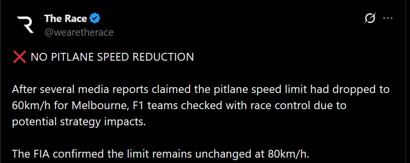 此前有多家媒体报道称,墨尔本站的维修区限速将降至60公里/小时。由于这一变化可能会直接影响比赛策略,各支F1车队也因此向赛事控制部门进行了确认。