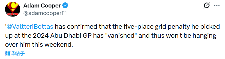 凯迪拉克车手博塔斯在刚刚进行的澳大利亚站官方新闻发布会上确认,他在2024年收官站所受到的罚退5位发车的处罚已经消失,意味着该处罚不会被带入本周的揭幕战当中执行。