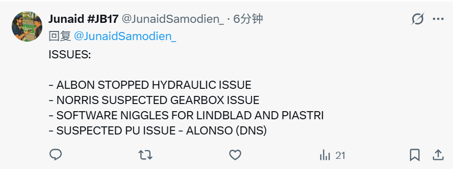 一练故障统计:马丁双车趴窝,6位车手曾遭遇赛车问题