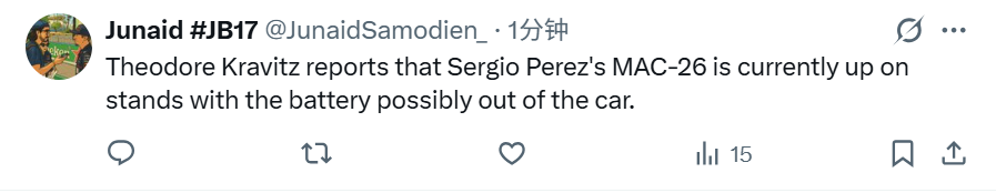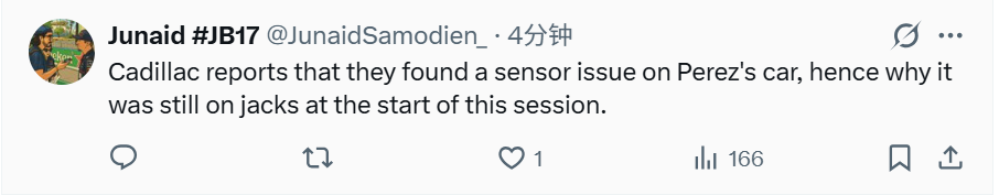 凯迪拉克车队随后确认,佩雷兹赛车上有传感器出现故障。他们力争在二练结束之前让佩雷兹重回赛道。
