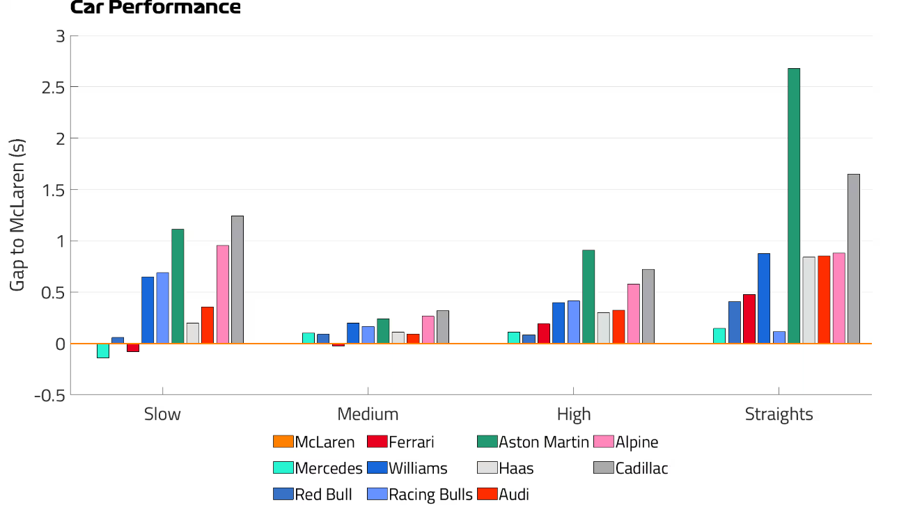 迈凯伦则是在高速弯中表现最好,除了阿斯顿马丁、凯迪拉克以及Alpine,其他车队的差距也相对较小。