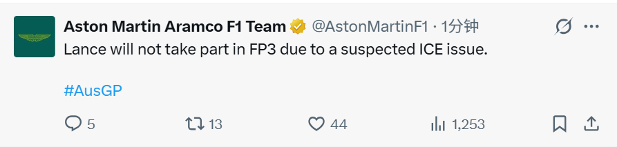 阿斯顿马丁:疑似内燃机故障,斯托尔不会参加三练