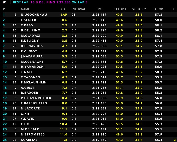 原本前10位冲线的车手里有3人吃到罚单:第3位冲线的奈尔和第9位起步的拉科尔特因为在发车红灯熄灭之前赛车有向前移动的情况,均被加罚5秒。第4位冲线的斯托姆斯泰德因为引发事故被加罚10秒。由于比赛最后时刻是在安全车情况下结束,3人冲线且加罚时间后均跌出前10位。