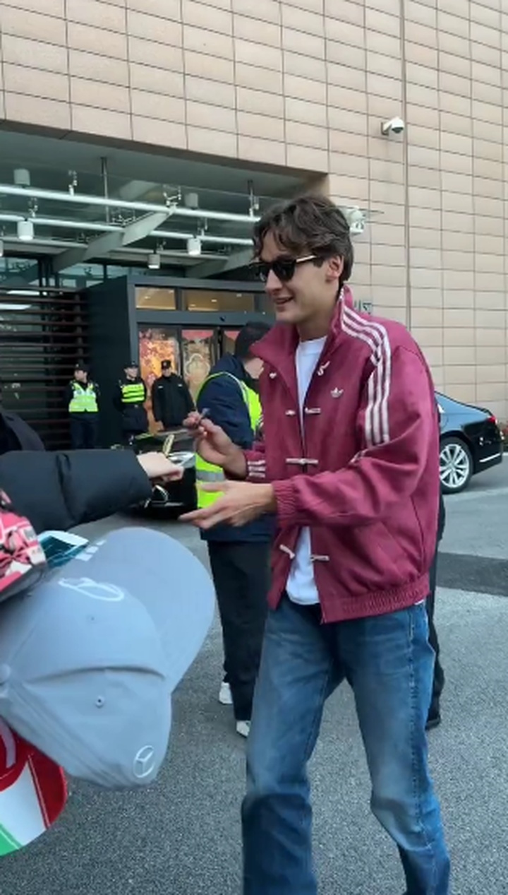 梅赛德斯车手拉塞尔昨天抵达上海后,在酒店门口为车迷签名。