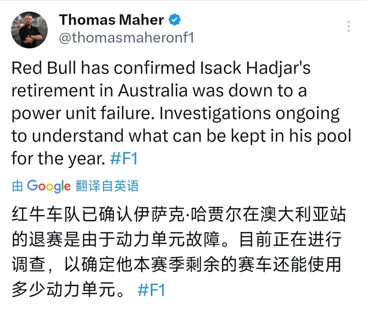 据F1知名记者Thomas Maher报道,红牛车队已经确认哈贾尔在澳大利亚站退赛是因动力单元故障。车队目前正在确认动力单元状况以确认本赛季还有多少动力单元可供使用。