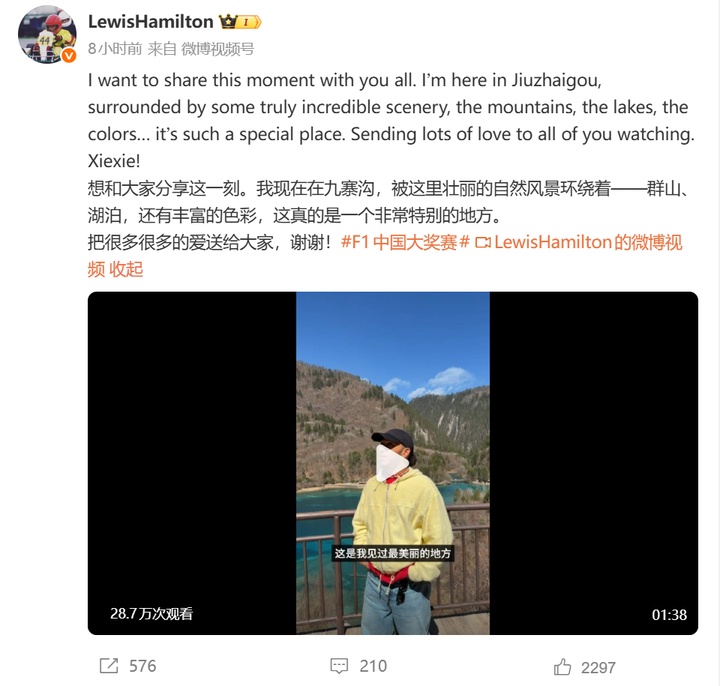 汉密尔顿的微博简要写道:想和大家分享这一刻。我现在在九寨沟,被这里壮丽的自然风景环绕着——群山、湖泊,还有丰富的色彩,这真的是一个非常特别的地方。