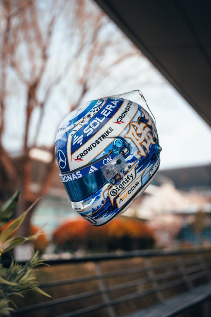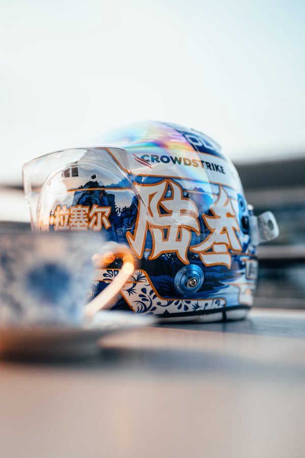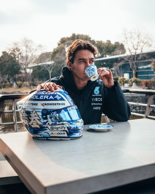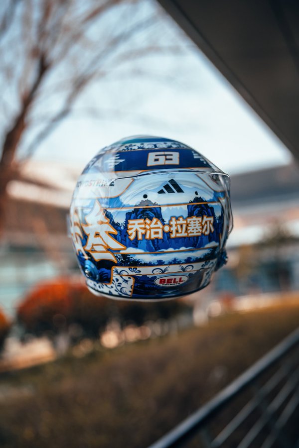 拉塞尔:新的中国站头盔!!很开心来到这样一个美丽的国家。今年的头盔灵感来源于当地的风景和中国瓷器,这一点从蓝白细节的对比中可以看出。感谢这里所有的支持,希望你们喜欢这个头盔。