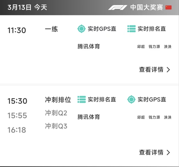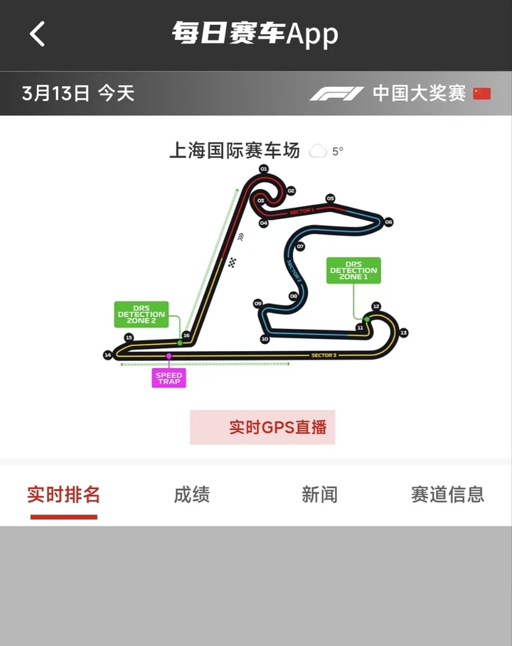 每日赛车App将在今天中午11:30以及下午15:30图文+数据直播F1中国站一练和冲刺排位赛的赛事。您只需将App升级到最新版本,在直播期间从“比赛”标签里点击“查看详情”,即可观看“实时排名直播”和“实时GPS直播”。