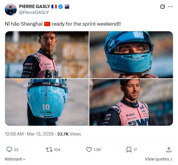 加斯利:你好上海,准备好迎接冲刺赛周末啦!!