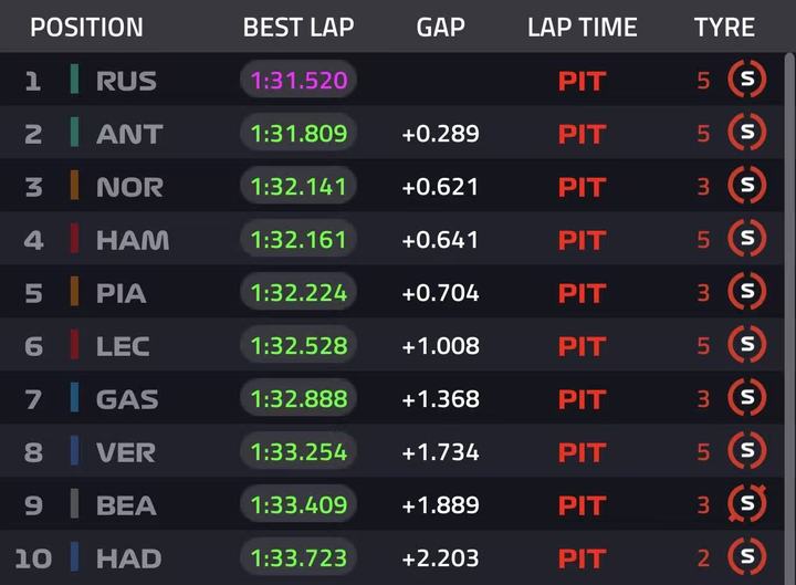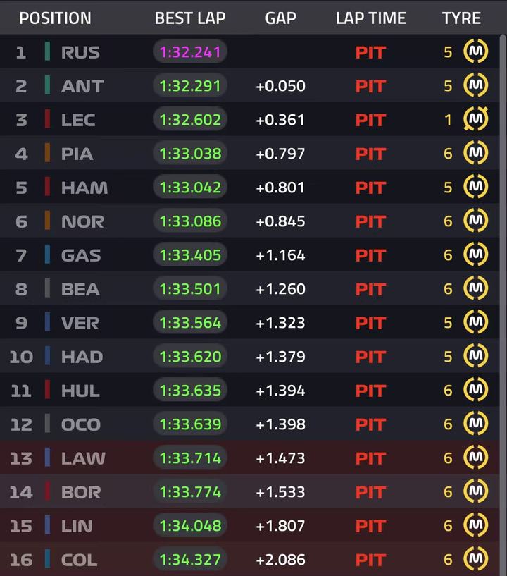 拉塞尔前两段刷紫1:32.241轻松上到P1,安东内利+0.329s P2,从P4开始的皮亚斯特里都在1:33+,维斯塔潘1:33.564在P7