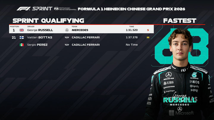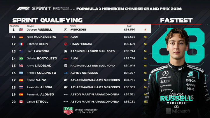 中国大奖赛冲刺排位赛结束,拉塞尔轻松拿下杆位,领先0.6s+,安东内利P2,诺里斯P3,汉密尔顿P4,皮亚斯特里P5,勒克莱尔P6,加斯利P7,维斯塔潘P8