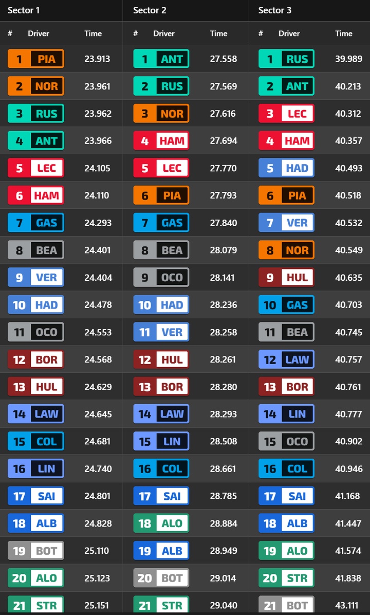 冲刺排位赛分段计时榜:第一段皮亚斯特里最快,第二段安东内利最快,第三段拉塞尔最快。