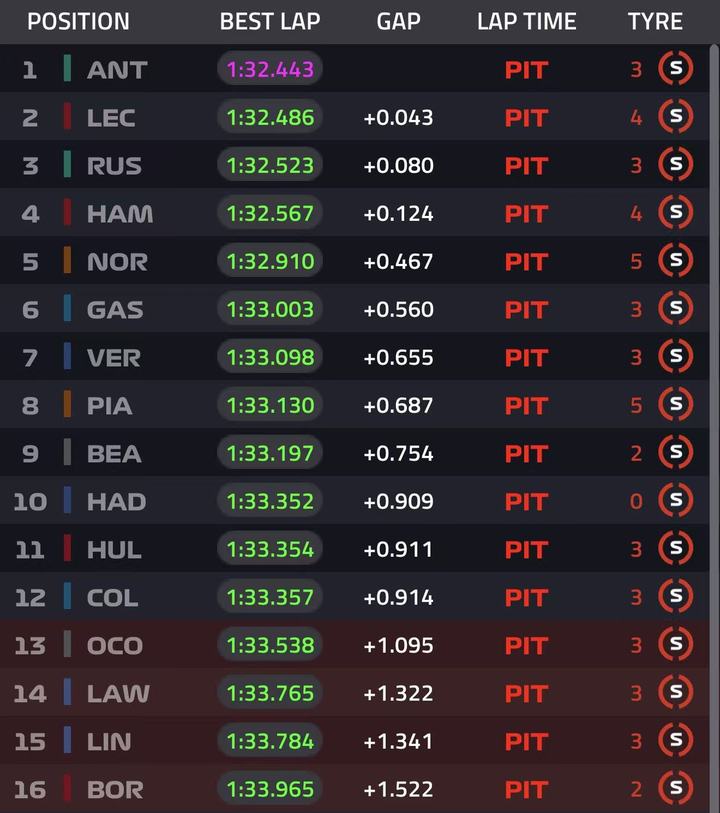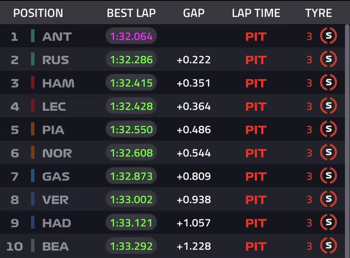 安东内利三段刷紫1:32.322上到P1,勒克莱尔1:32.623 P2,汉密尔顿慢队友0.4s P5