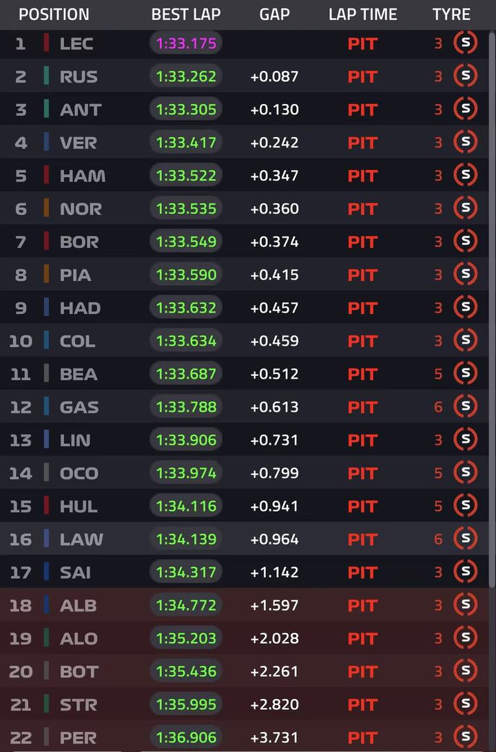 拉塞尔一三段刷紫1:32.523上到P1,汉密尔顿+0.311s P2,勒克莱尔1:32.902 P3,安东内利P4,维斯塔潘P5,贝尔曼P6