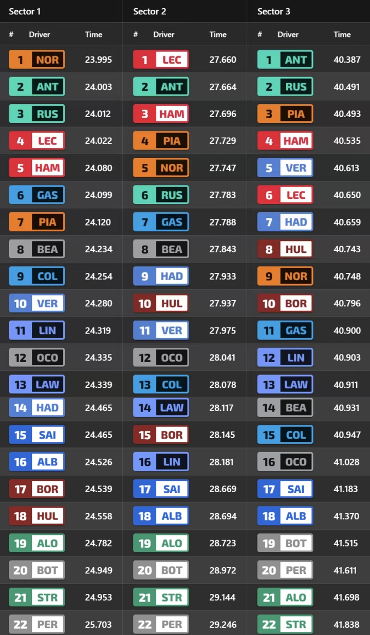 排位赛分段计时榜:诺里斯第一段最快,勒克莱尔第二段最快