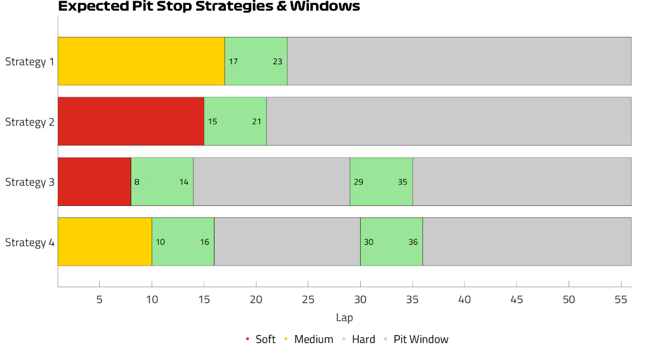 策略4:两停,中性胎起步,10到16圈换上硬胎,30到36圈换上另一套硬胎跑完余下比赛