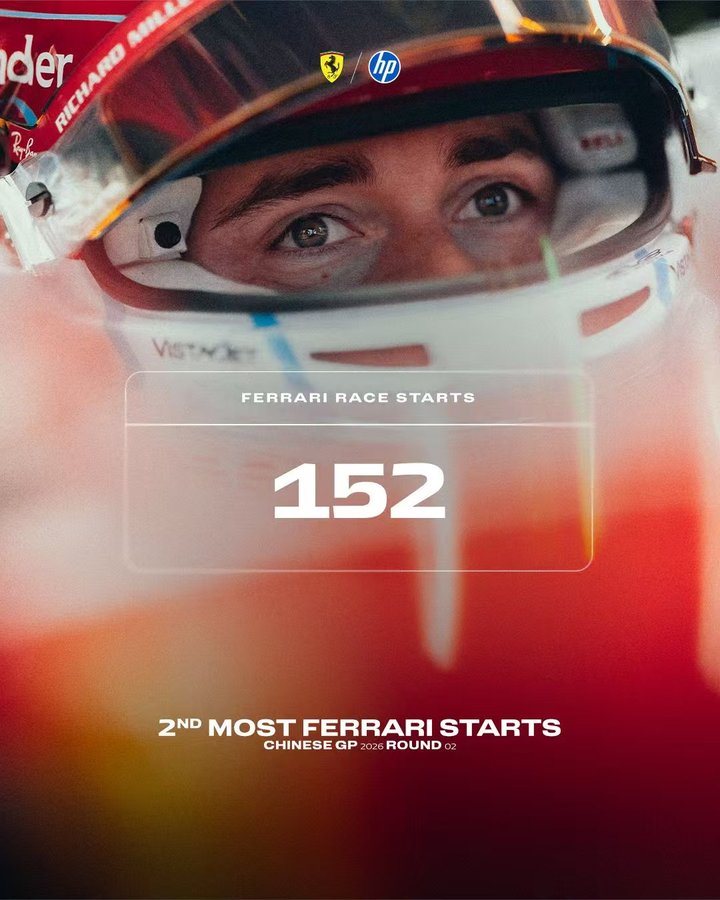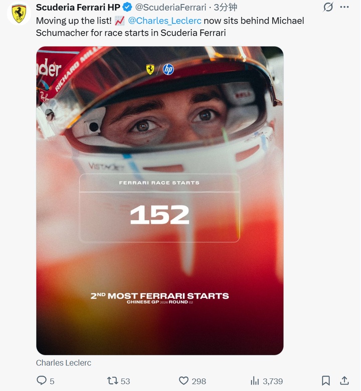 法拉利:恭喜勒克莱尔完成队史第152次起步,升至第二位