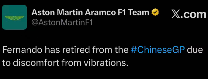 阿斯顿马丁:因为赛车振动导致不适,阿隆索退出比赛