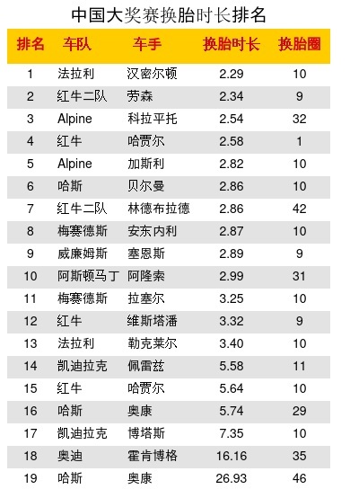 中国站换胎时长:汉密尔顿最快用时2.29s,劳森第2