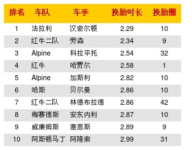 中国大奖赛换胎时长排名:法拉利车队的汉密尔顿第1名用时2.29s;第2名是劳森用时2.34s;第3名是科拉平托。前10名榜单见下图: