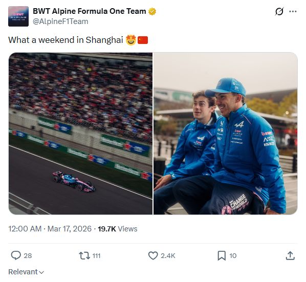 Alpine车队的加斯利和科拉平托在不久前结束的中国站正赛里分别取得第6以及第10位,帮助车队自2024年圣保罗站后再度达成双车取得积分的成就。