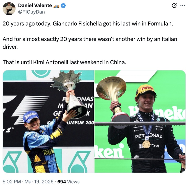 20年前的今天,费斯切拉收获了他在F1中的最后一场胜利。 在之后近乎整整20年里,再也没有意大利车手能够夺冠。 直到上周末安东内利在中国站打破了这一僵局。