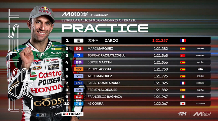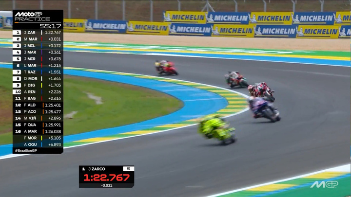在决定10个直通Q2名额的MotoGP组别练习赛里,LCR本田车队的老将扎科凭借1分21秒257的最快单圈拿到了头名。马奎·马奎兹紧随其后,新秀车手拉兹加里奥格鲁表现神勇拼下了第3名的佳绩。
